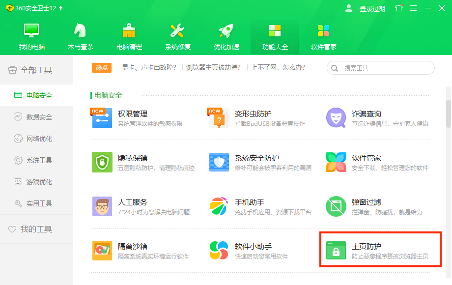 打开360安全卫士,点击顶部 功能大全 ,找到 主页防护