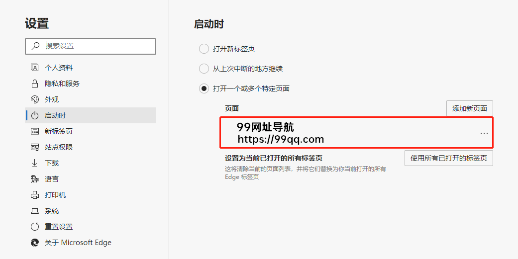 打开Micorsoft Edge浏览器,访问浏览器设置地址: edge://settings/onStartup